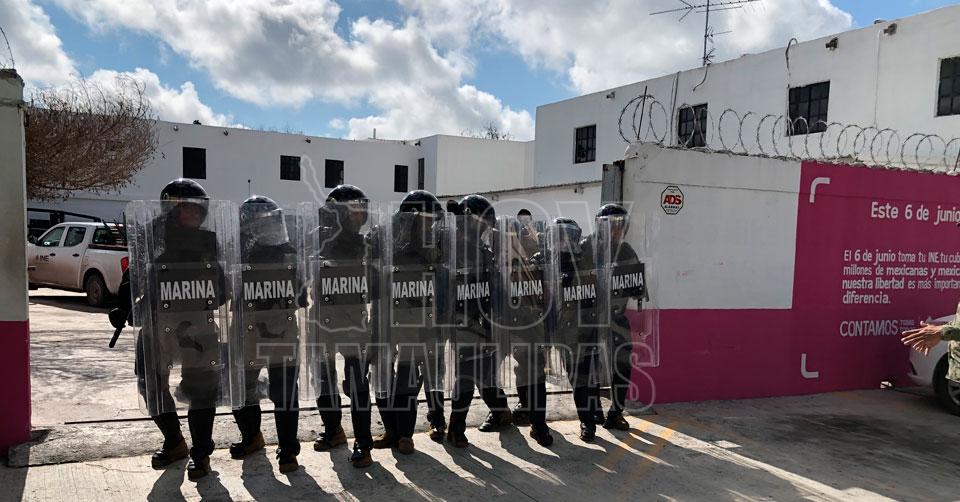 Matamoros, Tamaulipas. - La Secretaría de Marina llevó a cabo un simulacro con el grupo antimotines en las instalaciones del Instituto Nacional Electoral (INE) en Matamoros, con la finalidad de estar listos para cualquier contingencia que se pudiera presentar durante la jornada electoral.