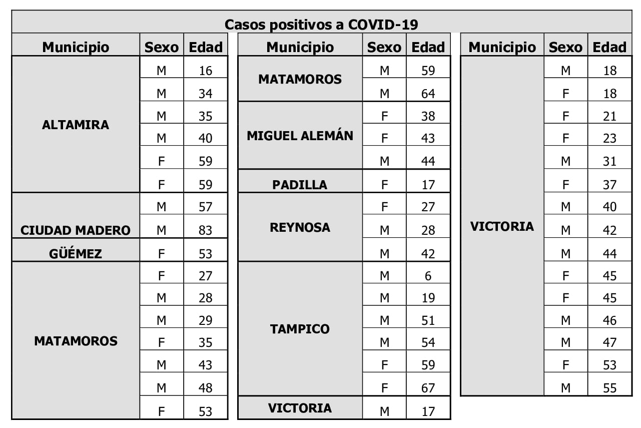 Mientras que los fallecimientos corresponden a los de tres hombres de 58, 64 y 54 años y tres mujeres de 72, 78 y 60 años de edad, todos en el municipio de Reynosa.