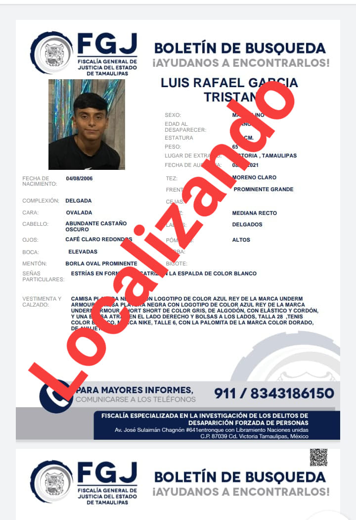 Ciudad Victoria, Tamaulipas.- El adolecente Luis Rafael García Tristán que había desaparecido ayer martes en Ciudad Victoria ya fue localizado, por lo que la familia agradeció a la ciudadanía que se unió a la búsqueda.