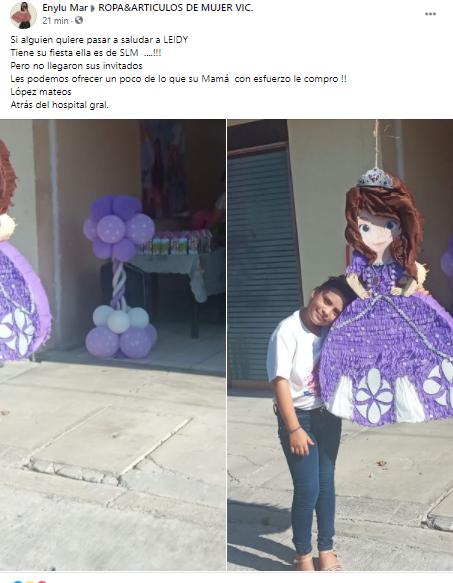 Ciudad Victoria, Tamaulipas.- Una niña se quedó esperando a los invitados que no asistieron a la caravana que le organizó su mamá para festejar su cumpleaños en Ciudad Victoria, por lo que ahora piden a los ciudadanos acudan para hacerla pasar un momento feliz.