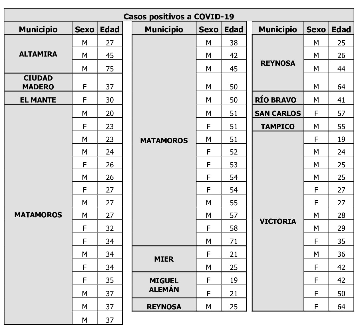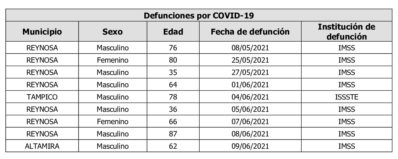 Mientras que las nueve defunciones corresponden a: siete en Reynosa, de los cuales cinco son hombres de 76, 35,64, 36 y 87 años de edad, mientras que dos son mujeres de 80 y 66 años de edad.