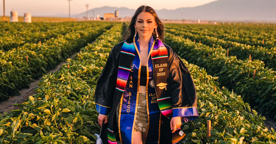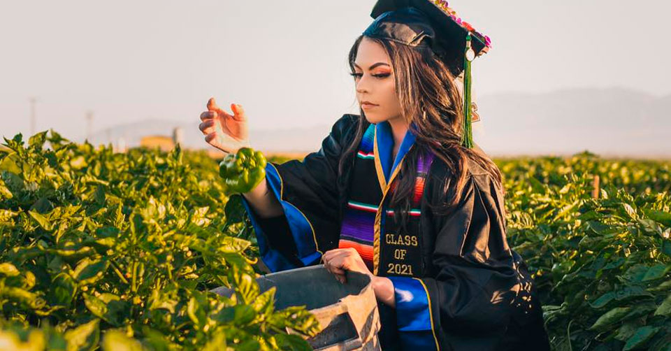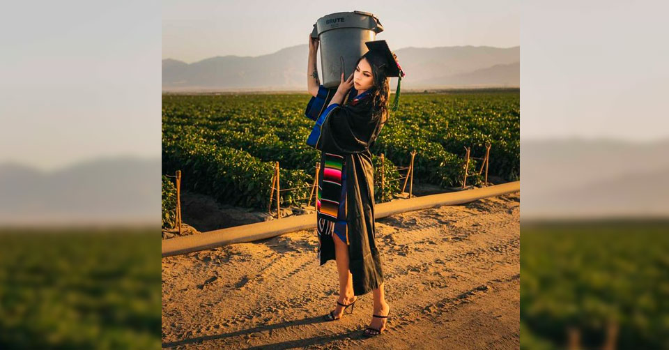 Realiza sesión de fotos como graduada junto a sus padres migrantes en campo de California