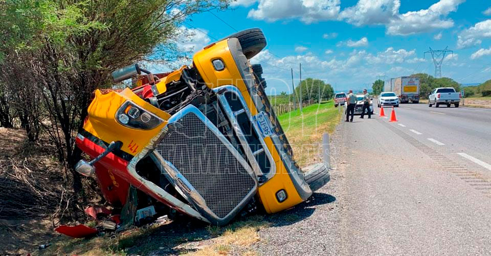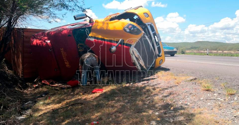Ciudad Victoria, Tamaulipas. – Un tracto camión doble articulado con dos contenedores volcó este mediodía en el kilómetro 52 de la carretera Zaragoza-Victoria, dejando como saldo al chofer con lesiones leves y cuantiosos daños materiales.