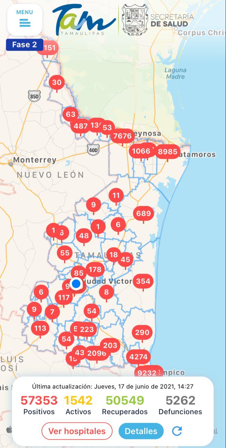 Los municipios de Altamira, Ciudad Madero, Matamoros, Nuevo Laredo, Reynosa, Río Bravo, Tampico y Victoria, son los que presentan el mayor número de casos activos y altos contagios.