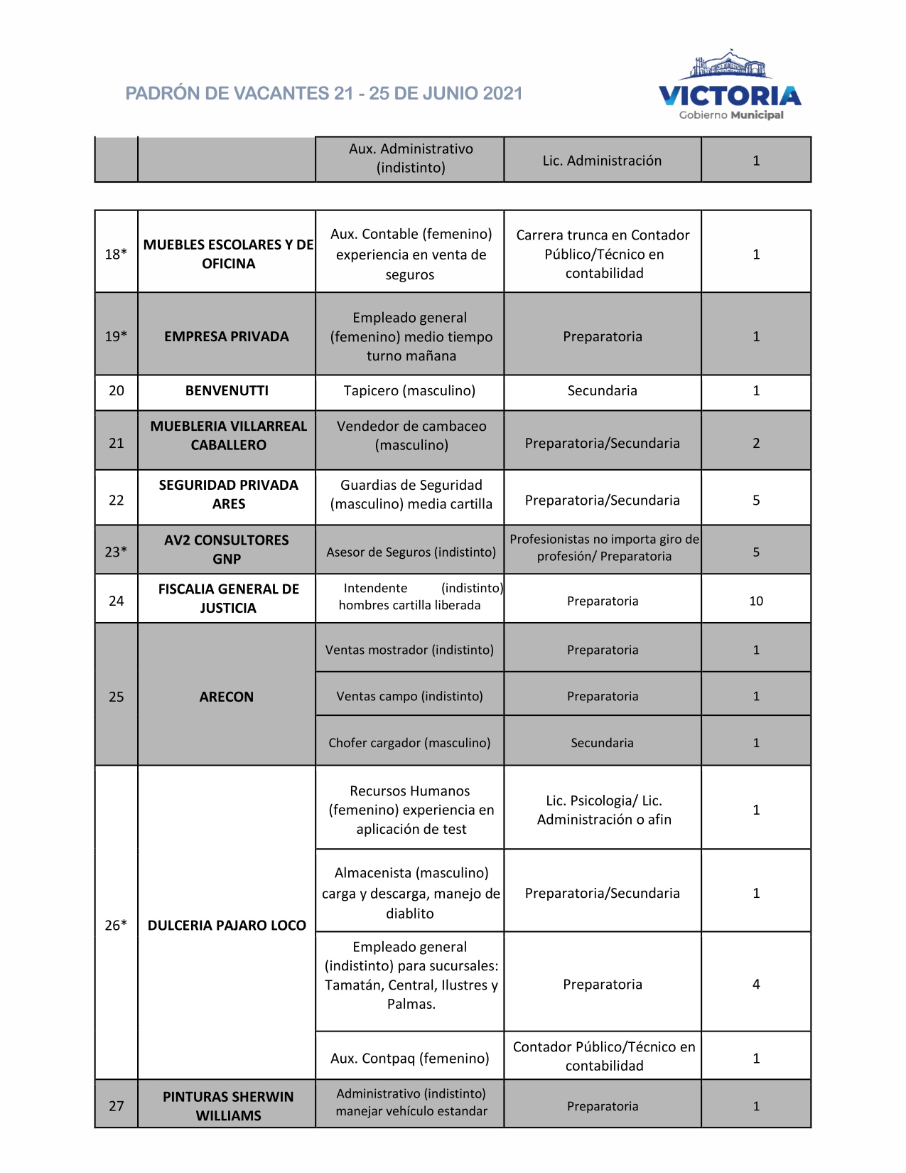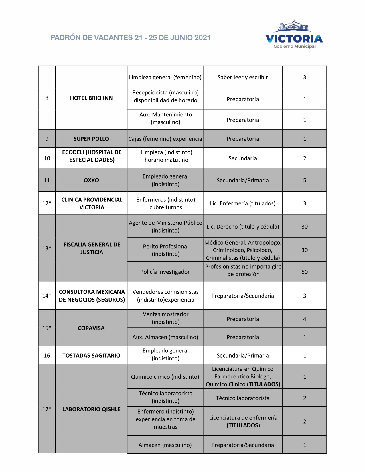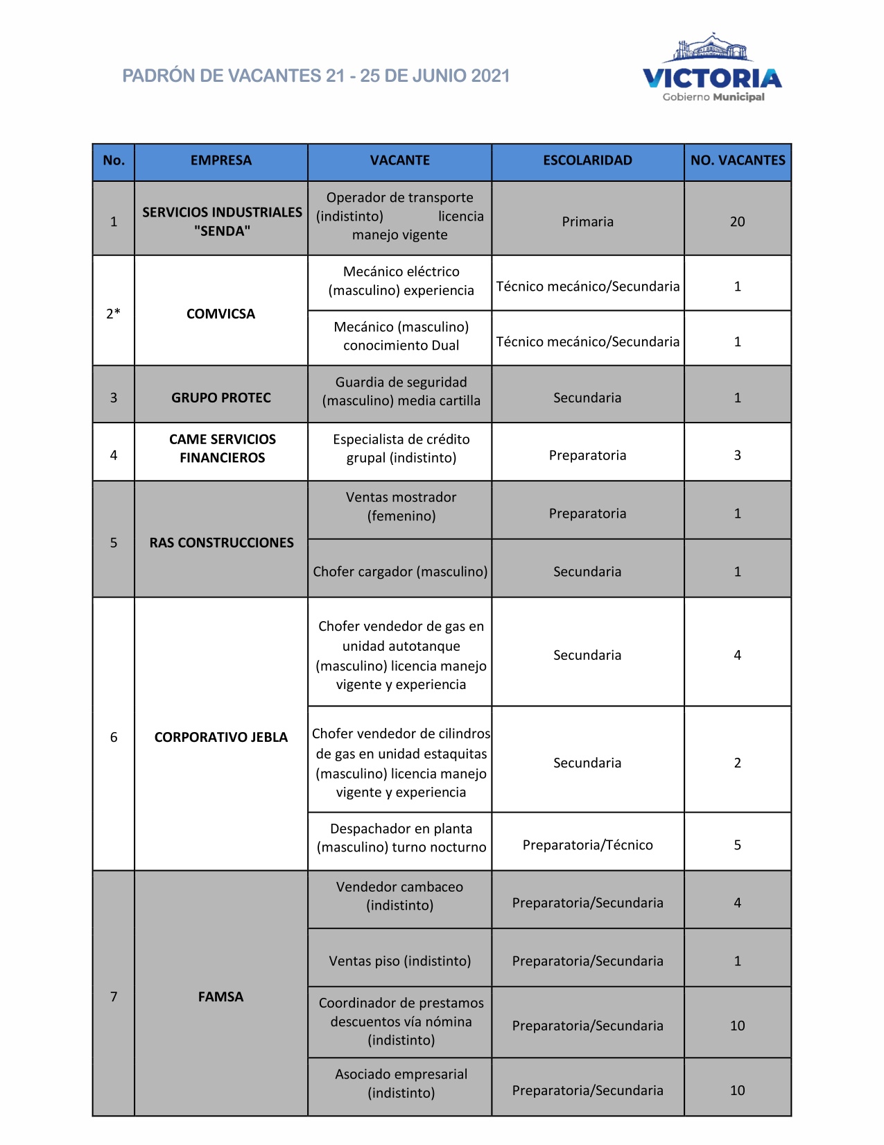 Si estás interesado en alguno de los puestos puedes enviar tu información al siguiente correo electrónico: desarrollo.economico@ciudadvictoria.gob.mx