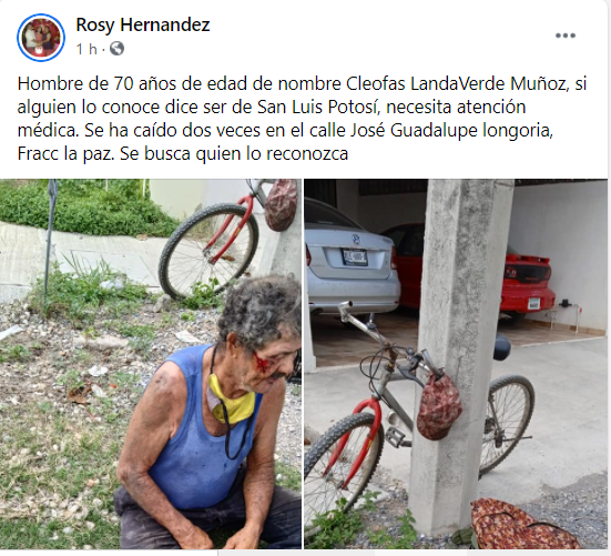 Si alguien reconoce a Cleofas LandaVerde Muñoz puede comunicarse con Rosy Hernández vía Facebook.