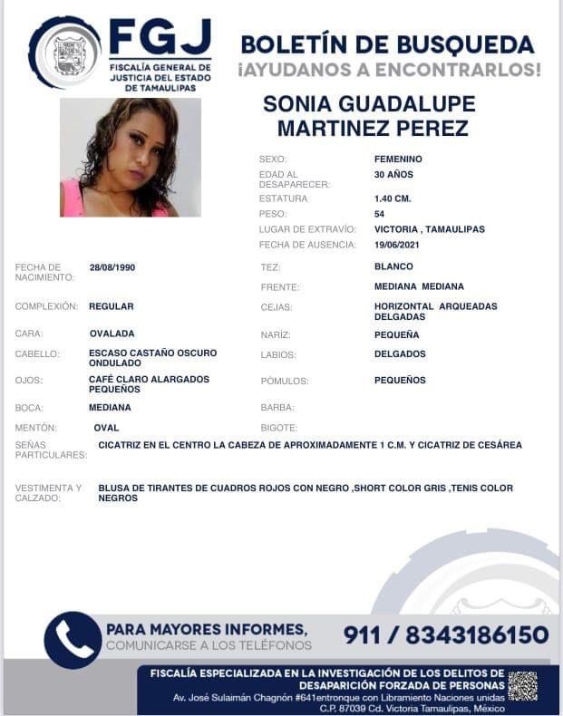 Sonia tiene 30 años de edad, mide 1 metro 40 centímetros de estatura y es de tez blanca, según información proporcionada por la FGJ de Tamaulipas.