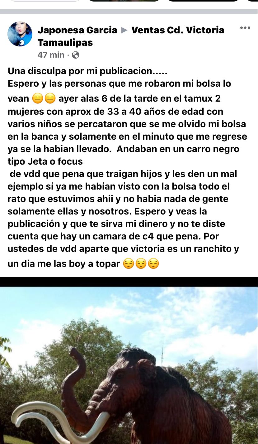 “Espero y las personas que me robaron mi bolsa lo vean, ayer al as 6 de la tarde en el Tamux 2 mujeres con aproximadamente de 33 a 40 años de edad con varios niños se percataron que se me olvidó mi bolsa en la banca y solamente en el minuto que me regrese ya se la habían llevado. Andaban en un carro negro tipo Jeta o Focus".