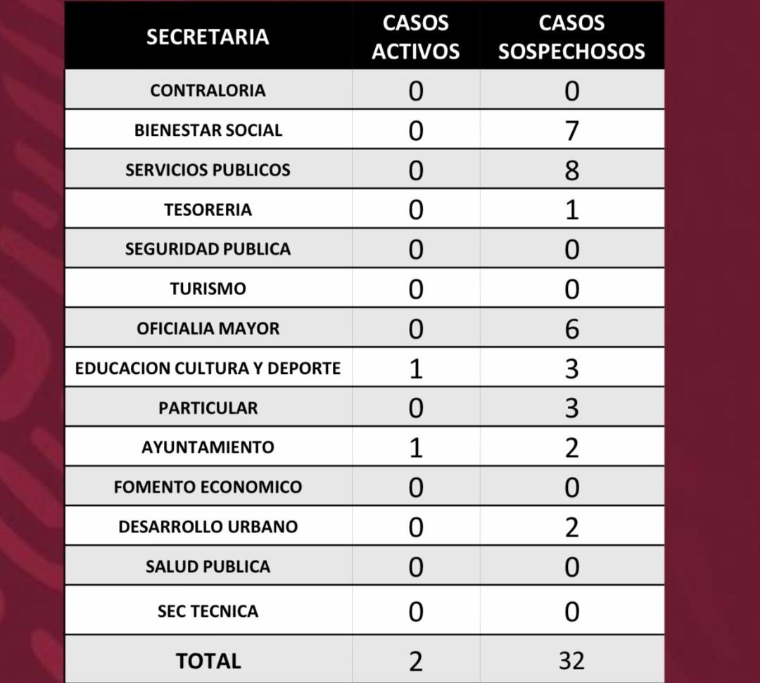 La titular de la dependencia municipal, Nidia Maldonado Ruiz, confirmó que en la Secretaría de Servicios Públicos se cuenta con un total de ocho casos, Bienestar Social con siete, Tesorería uno, Oficialía Mayor seis, Educación, Cultura y Deporte tres, Secretaría Particular tres, Ayuntamiento dos, Desarrollo Urbano dos, de todos ellos existen dos graves.