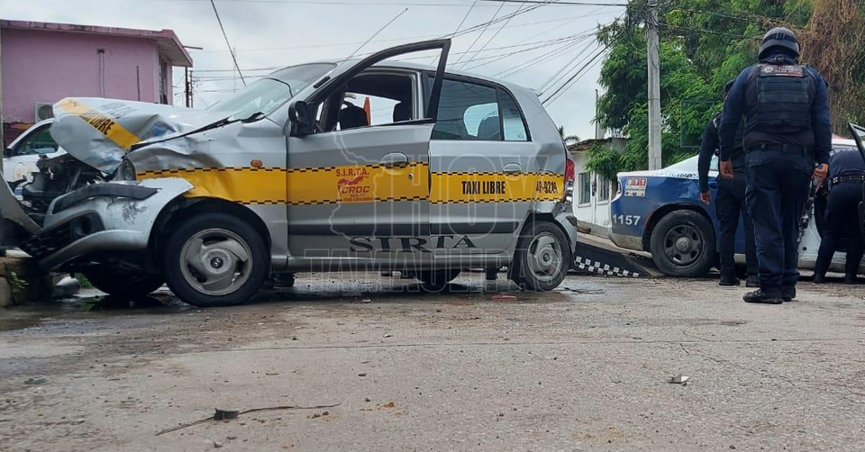 La patrulla terminó por impactarse en contra de una banqueta y un poste de concreto, quedando con severos daños, mientras que el Taxi dio una voltereta en su propio eje y salió proyectado hacia la acera de enfrente, impactando en contra de una barda.