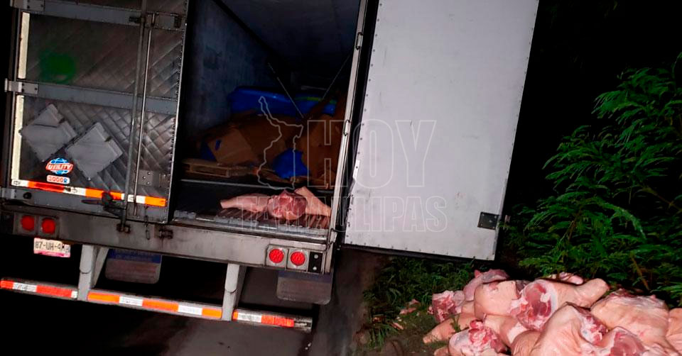 Ciudad Victoria, Tamaulipas. – Para no perder la costumbre lugareños, automovilistas y hasta choferes de tráileres rapiñaron piernas de cerdo de una caja de un tracto camión, luego de que este fuera abandonado por su chofer tras protagonizar una carambola en la Rumbo Nuevo.