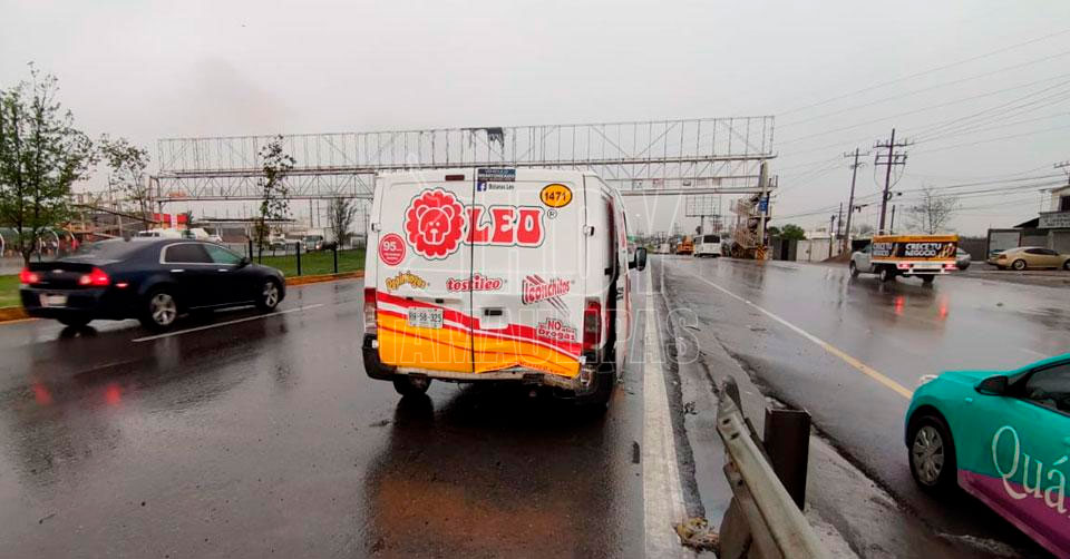 Reynosa, Tamaulipas. – El chofer de un tracto camión resultó lesionado esta mañana luego de proyectarse contra una valla metálica, tras impactarse contra una Van repartidora de Sabritas en Reynosa, Tamaulipas.