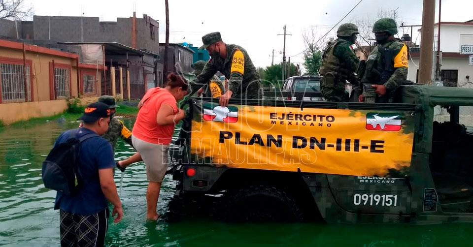 Reynosa, Tamaulipas. – Alrededor de 50 familias que se vieron afectadas por la inundación que dejaron las recientes lluvias en Reynosa, fueron auxiliadas por elementos de la Secretaría de la Defensa Nacional (Sedena) adscritos a la Comandancia de la 8/a. Zona Militar.