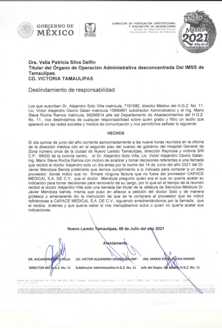 En un comunicado signado por el director del nosocomio en mención Alejandro Soto Villa, el subdirector administrativo Víctor Alejandro Osorio Galán y el jefe de abasto Mario Steve Rocha Ramos, se precisa que el día 14 por la noche el director recibió la llamada de Mendoza Banda indicándole que no firmaría ninguna factura que no fuera de CAPACE MEDICAL S.A. de C.V.