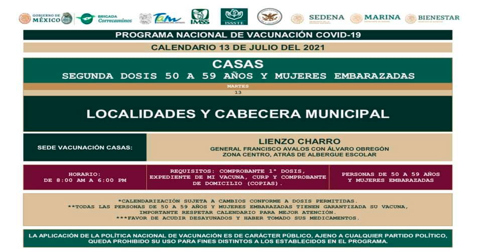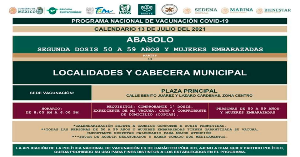 Ciudad Victoria, Tamaulipas. - La aplicación de la segunda dosis de la vacuna contra Covid-19 a las personas de 50 a 59 años y mujeres embarazadas iniciará en Abasolo y Villa de Casas el próximo martes 13 de julio y el miércoles 14 será en Llera, informó el coordinador de los Programas Federales para el Desarrollo de Tamaulipas, José Ramón Gómez Leal.
