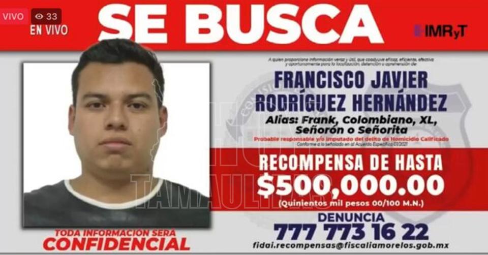 Cuernavaca, Moreles. - La Mesa de Seguridad de Morelos anunció este lunes el ofrecimiento de una recompensa de medio millón de pesos para quien ofrezca datos concretos que permitan la captura del líder del cartel “Los Colombianos”, Francisco Javier Rodríguez Hernández, conocido como el “XL” ó “El Señorón”.