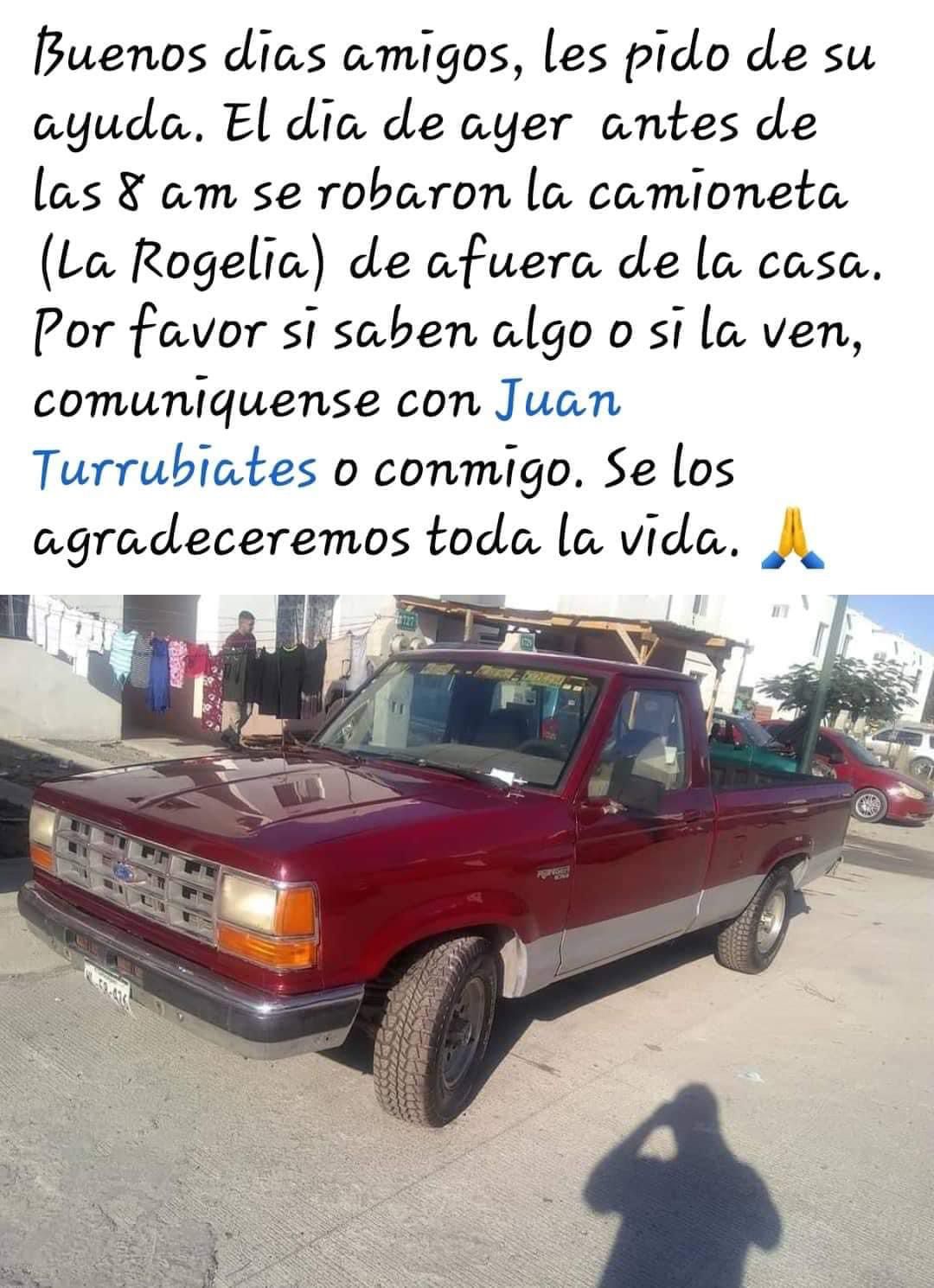 “Buenos días amigos, les pido de su ayuda, el día de ayer antes de las 8:00 am se robaron la camioneta (La Rogelia), de afuera de la casa. Por favor si saben algo o si la ven, comuníquense con Juan Turrubiates o conmigo, se los agradeceremos toda la vida”, posteó la usuaria.