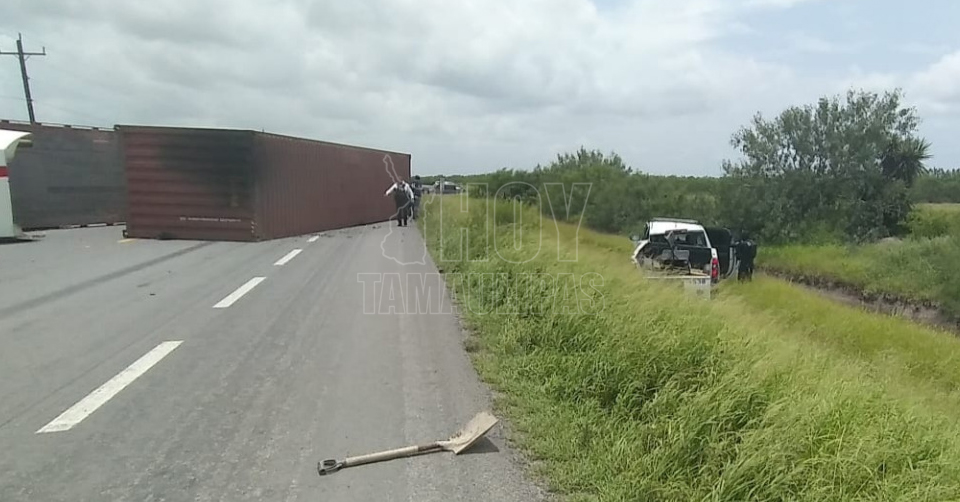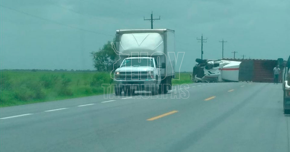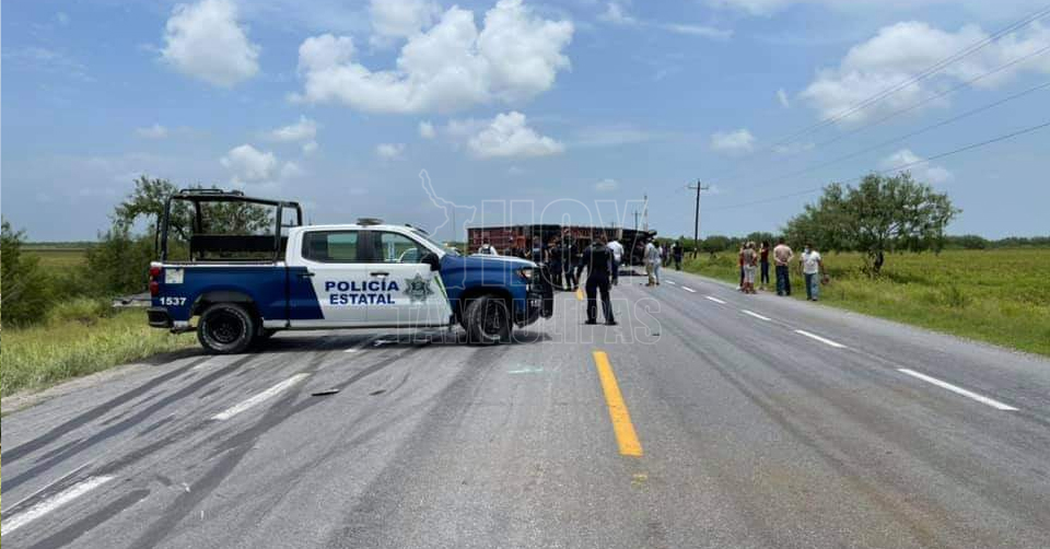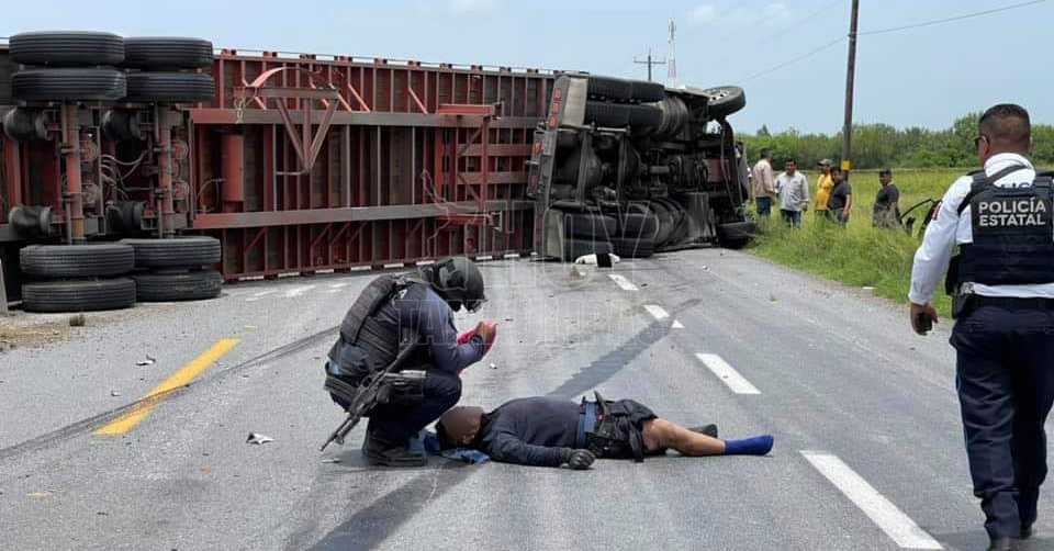 San Fernando, Tamaulipas. - Un policía estatal de la Patrulla 1538 murió en la carretera federal Matamoros-Víctoria tras choque volcadura en la entrada a El Barrancón con un trailer que terminó volcado.