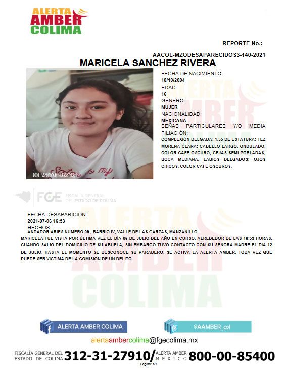 Manzanillo, Colima. – Autoridades de Colima activaron la Alerta Amber por la desaparición de Maricela Sánchez Rivera de 16 años de edad, quien fue vista por última vez el pasado 6 de julio.
