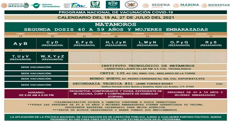 Matamoros, Tamaulipas. - Las autoridades federales dieron a conocer el calendario oficial de vacunación de la segunda dosis de Sinovac, para las personas de 40 a 59 años de edad de Matamoros que iniciará este próximo lunes 19 al 27 de julio.