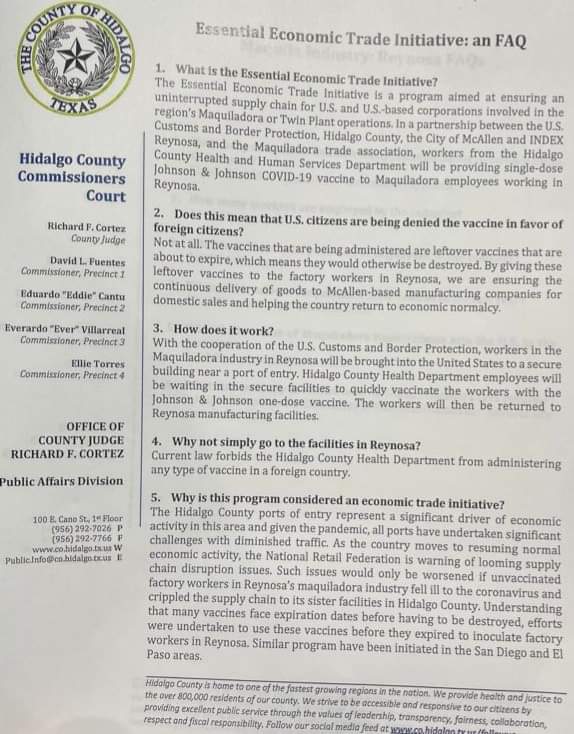 En el comunicado, se destacó que si las vacunas no se utilizaban serían destruidas, por lo que se decidió aplicarlas a los trabajadores de maquiladoras en Reynosa y así asegurar la entrega continua de productos a las empresas manufactureras con sede en McAllen para las ventas nacionales y ayudando al país a volver a la normalidad económica.
