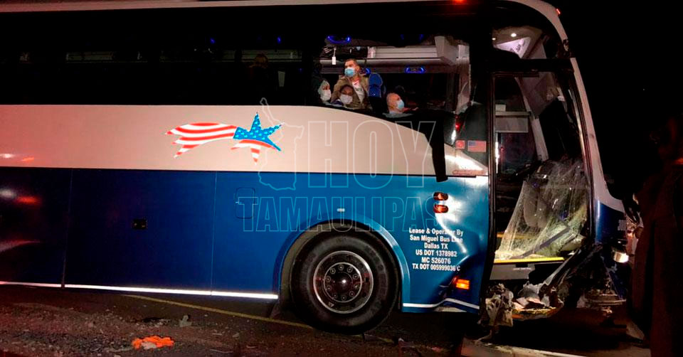 Nuevo Laredo, Tamaulipas. ─ Más de 40 usuarios de un autobús foráneo salieron ilesos luego de que la unidad en la que viajaban de Dallas, Texas a Guanajuato, fue impactada por una camioneta, cuyo conductor huyó del lugar en Nuevo Laredo.