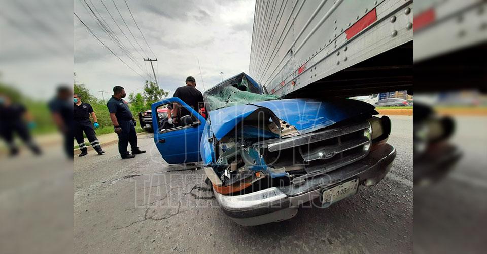 Nuevo Laredo, Tamaulipas. - Luego de pasarse un semáforo en luz roja, un conductor estrelló su camioneta contra la caja de un tráiler en la Carretera Aeropuerto, en Nuevo Laredo y quedó prensado de un brazo.