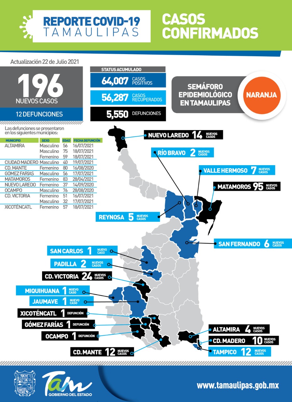 Covid-19 en Tamaulipas: 196 nuevos casos y 12 muertes