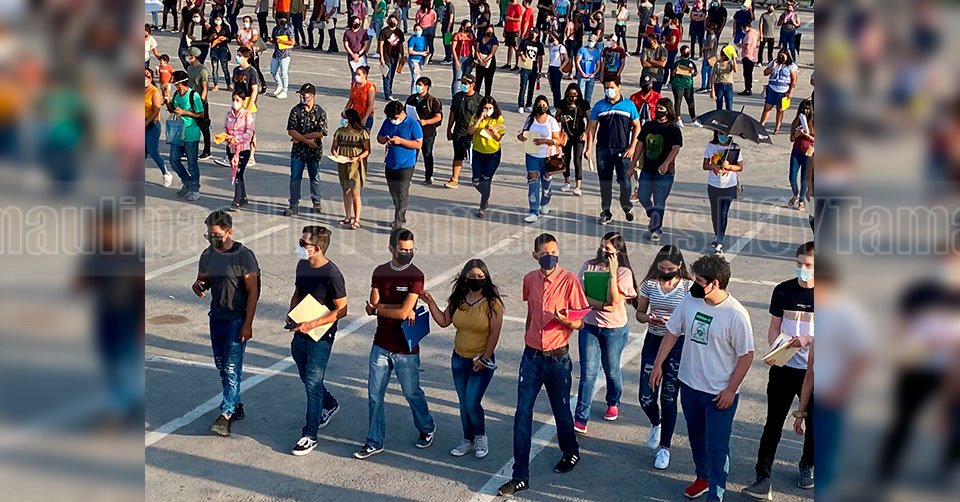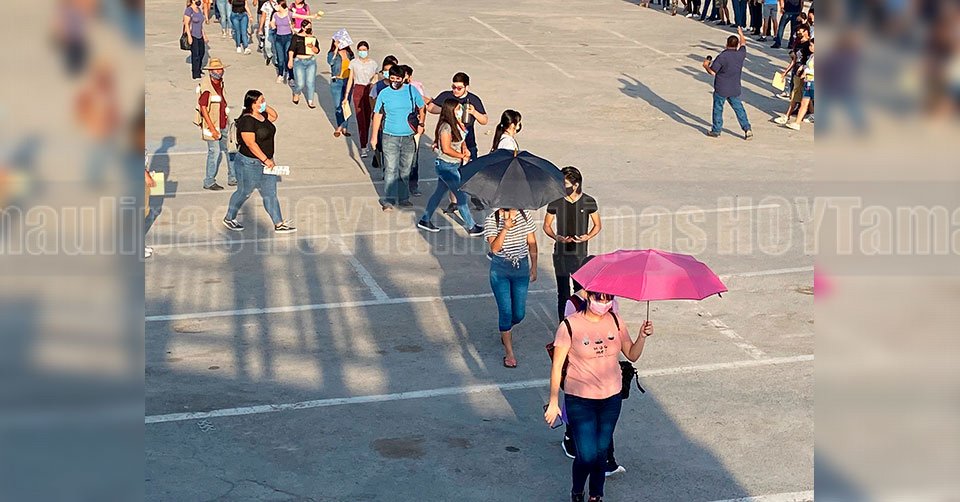 Largas filas se observan en los diferentes módulos de vacunación contra la Covid-19 en los municipios del norte de Tamaulipas, en el primer día para la población de 18 a 39 años de edad