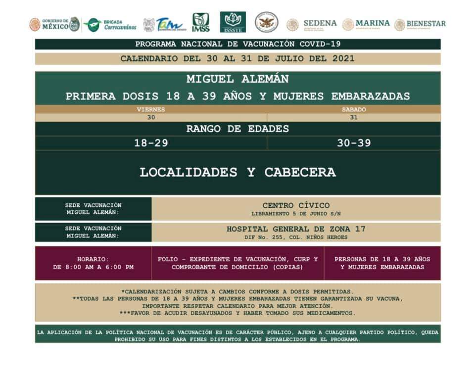 Ciudad Victoria, Tamaulipas. - El coordinador de programas federales para el desarrollo de Tamaulipas, José Ramón Gómez Leal, informó que el próximo viernes 30 de julio iniciará la vacunación contra Covid-19 a los jóvenes de 18 a 39 años de edad en los municipios de Miguel Alemán, Guerrero y Mier.