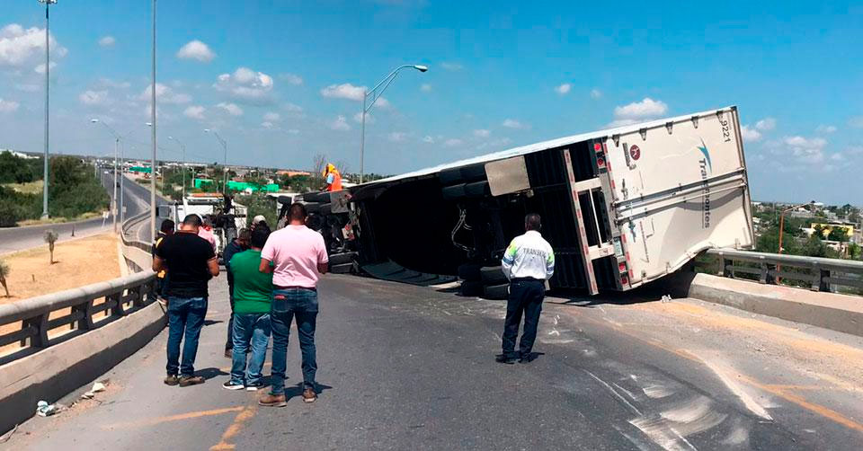 Nuevo Laredo, Tamaulipas. — Un chofer de tractocamión salió lesionado al volcar en la parte alta del puente de Transformación en Nuevo Laredo, debido al exceso de velocidad.