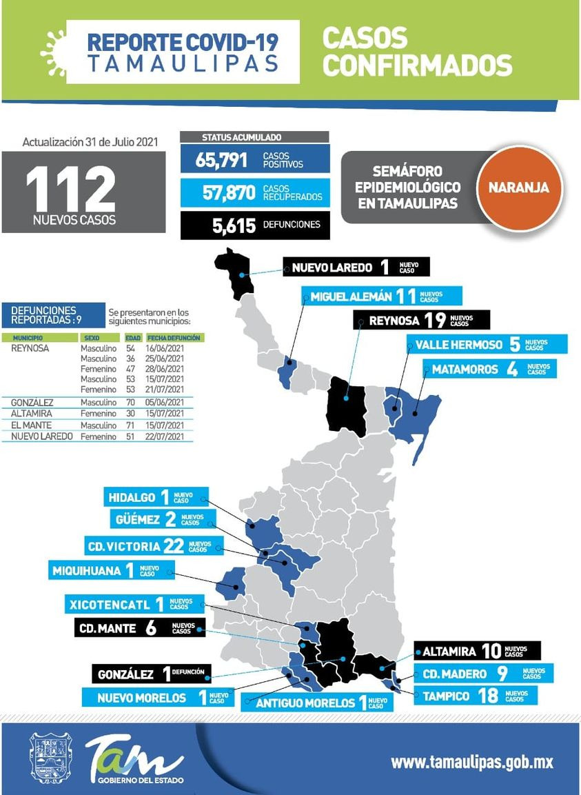 Además, hubo un contagio más en Nuevo Laredo, Xicoténcatl, Hidalgo, Antiguo Morelos, Nuevo Morelos y Miquihuana.