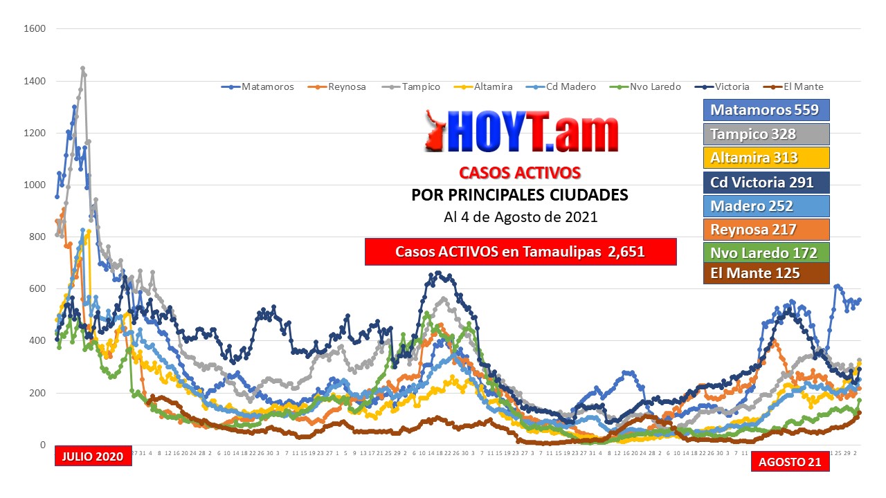 Los contagios se registraron principalmente: 91 en Matamoros, 55 en Victoria, 50 en Nuevo Laredo, 36 en Reynosa, 33 en Ciudad Madero y 32 en Altamira