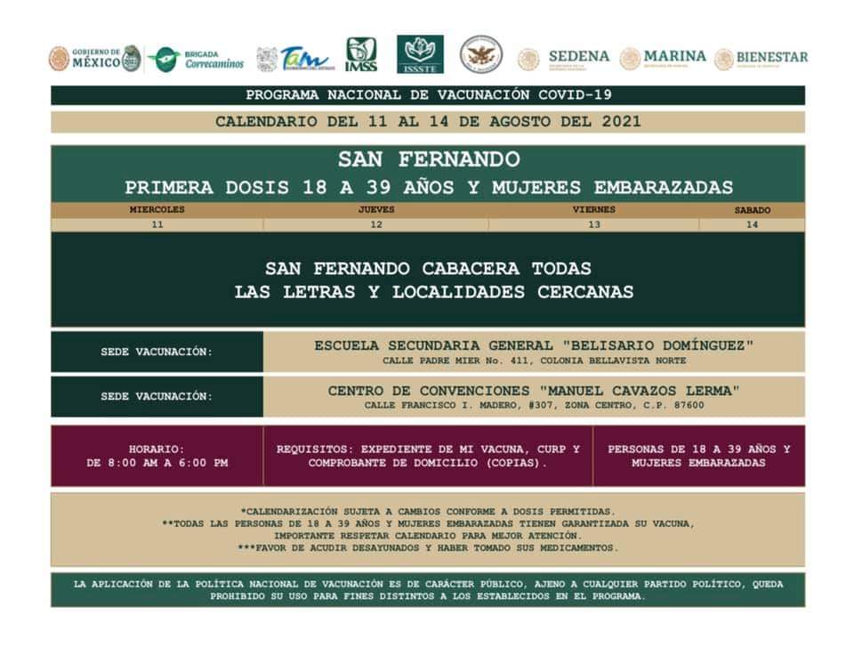 Ciudad Victoria, Tamaulipas. - Las vacunas anti Covid para jóvenes de 18 a 39 años se aplicarán a partir del próximo miércoles 11 de agosto en el municipio de San Fernando, anunció el delegado de los Programas Federales para el Desarrollo de Tamaulipas, José Ramón Gómez Leal.