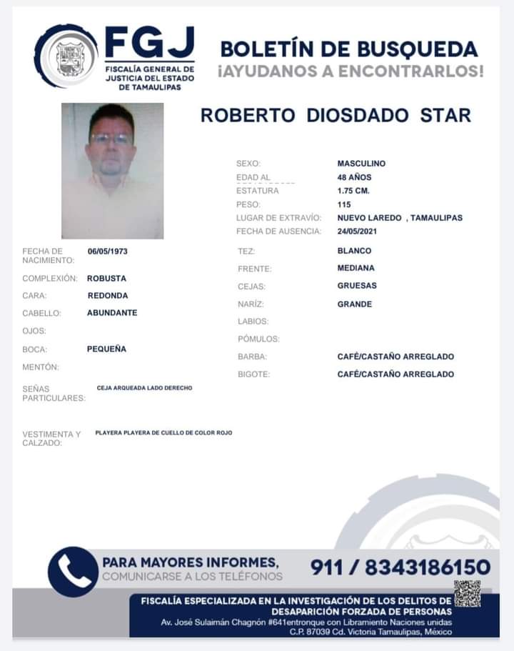 Ciudad Victoria, Tamaulipas. – Luego de más de dos meses de desaparecido, familiares y amigos del reynosense Roberto Diosdado Star, de 48 años de edad, solicitan la ayuda de la ciudadanía para dar con su paradero.