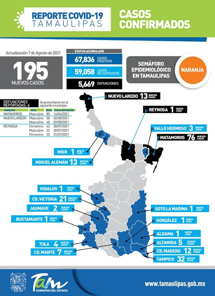 Ciudad Victoria, Tamaulipas. - Un total de 195 nuevos contagios de Covid-19 y 6 fallecimientos por la enfermedad se confirmaron este sábado 7 de julio en Tamaulipas, informó la Secretaría de Salud del Estado.