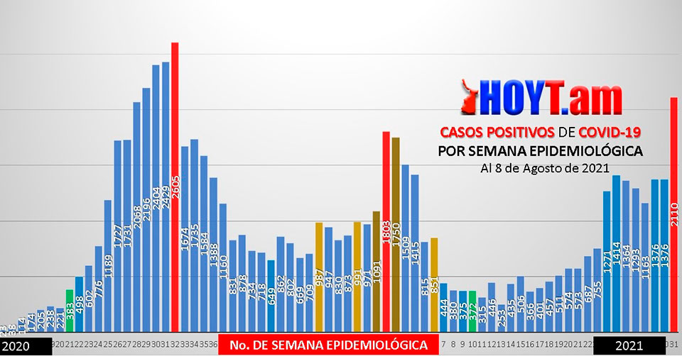El alza en contagios tuvo un repunte hasta en la Semana 24 que comprendió del 13 al 19 de junio, cuando el Estado registró 1,271 nuevos contagios, a partir de esa fecha se mantuvo por arriba de las mil infecciones, hasta que en la Semana Epidemiológica 31 que comprendió del 1 al 7 de agosto llegó a los 2,110 casos; la semana anterior hubo 1,376 infecciones.