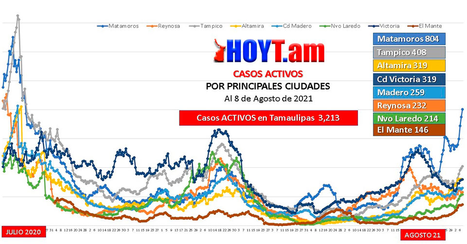La crisis sanitaria se sigue dando en estos municipios: Matamoros con 804 casos, Tampico con 408, Victoria y Altamira con 319 casos, Ciudad Madero con 259, Reynosa con 232, Nuevo Laredo con 214 y El Mante con 146 casos activos.