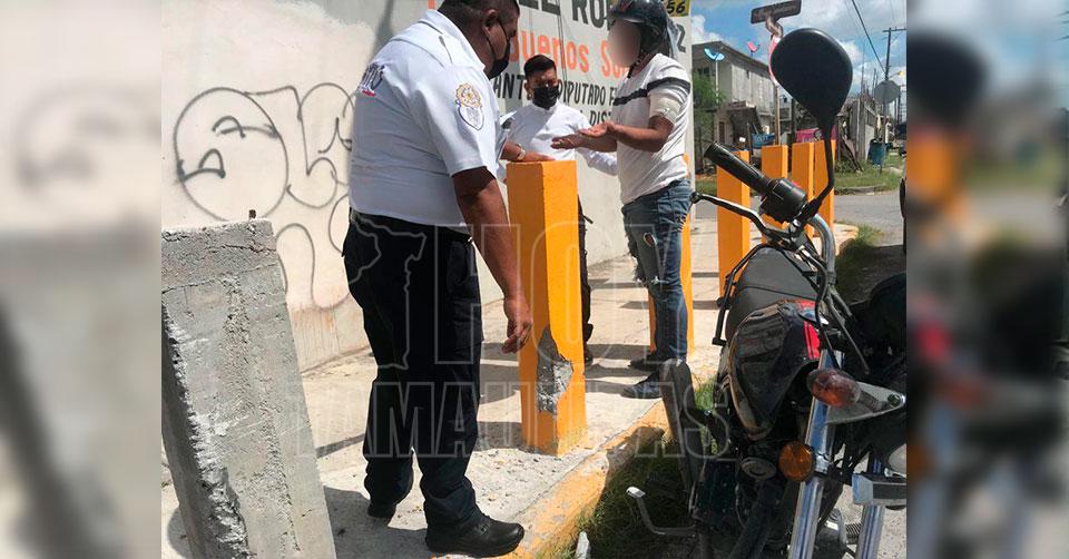 Matamoros, Tamaulipas. - Un joven que dijo trabajar en un Casino de Matamoros resultó con una herida en el brazo izquierdo, luego de impactar su motocicleta contra la base de un muro de contención, de concreto.
