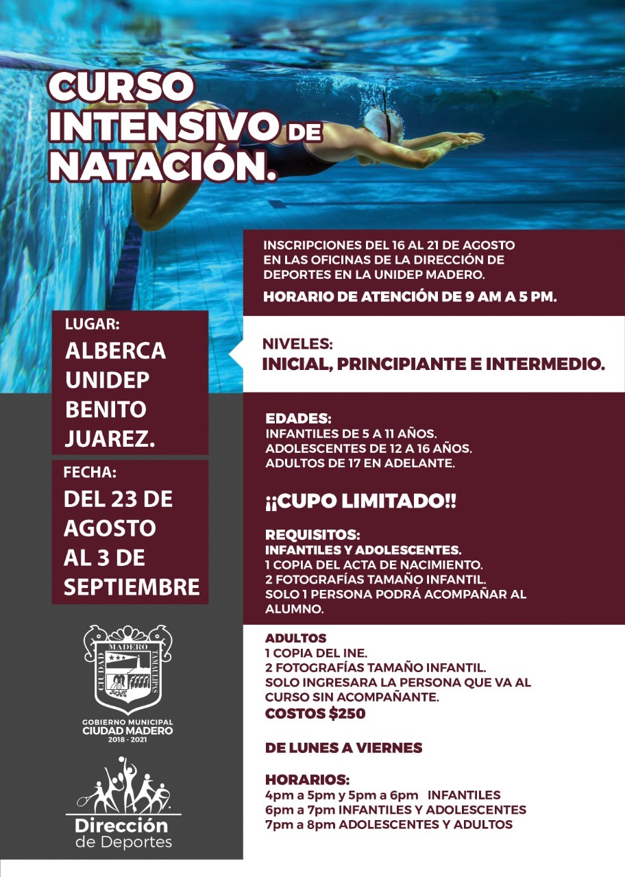 La Dirección de Deportes del municipio invita al Curso Intensivo de Natación, que se llevará a cabo del 23 de agosto al 3 de septiembre, en la alberca de la Unidad Deportiva “Benito Juárez”