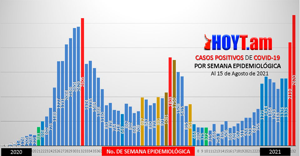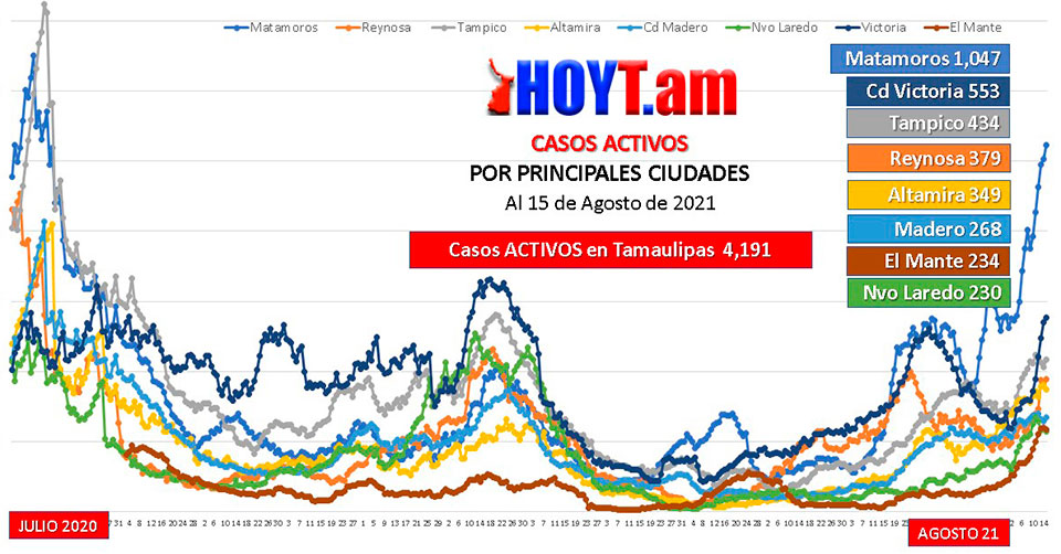 Ciudad Victoria, Tamaulipas. - La tercera ola de contagios de Covid-19, mantiene al día de hoy a 4,191 personas contagiadas en Tamaulipas, 978 más que la semana pasada, es decir, es el número de casos activos, esto de acuerdo a las cifras oficiales de la Secretaría de Salud.