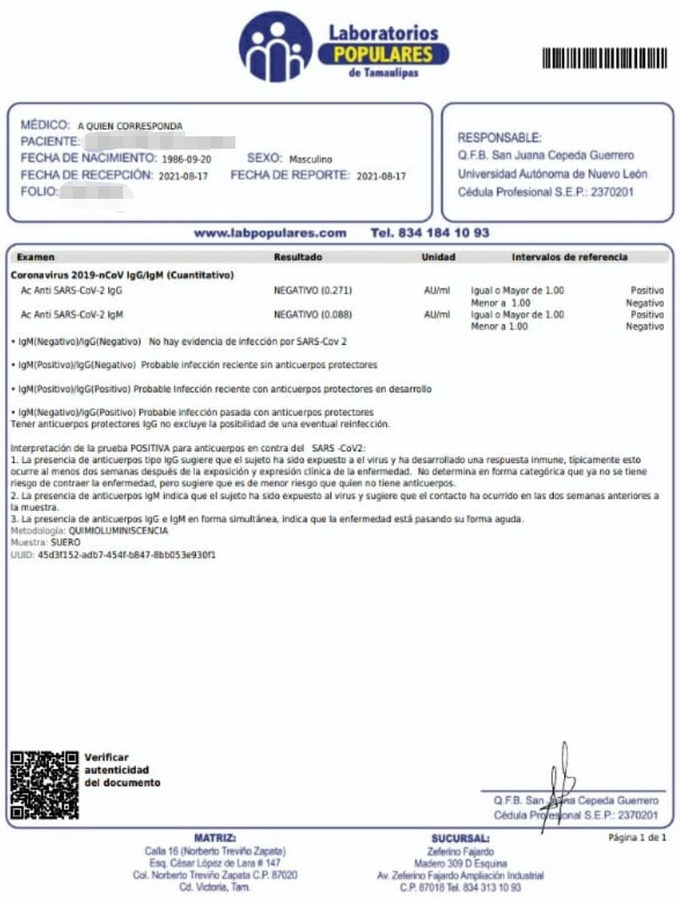 Y fue así que optaron por acudir a un laboratorio local para realizarse el Examen Coronavirus 2019-nCoV IgG/IgM (Cuantitativo), mismo que tiene un costo de 800 pesos.