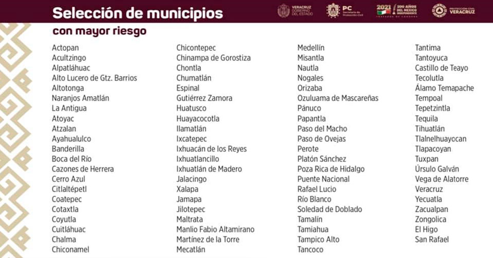 También, dijo que estará suspendido el tránsito vehicular en la carretera federal 180 durante el fenómeno meteorológico, en el tramo Poza Rica – Nautla.