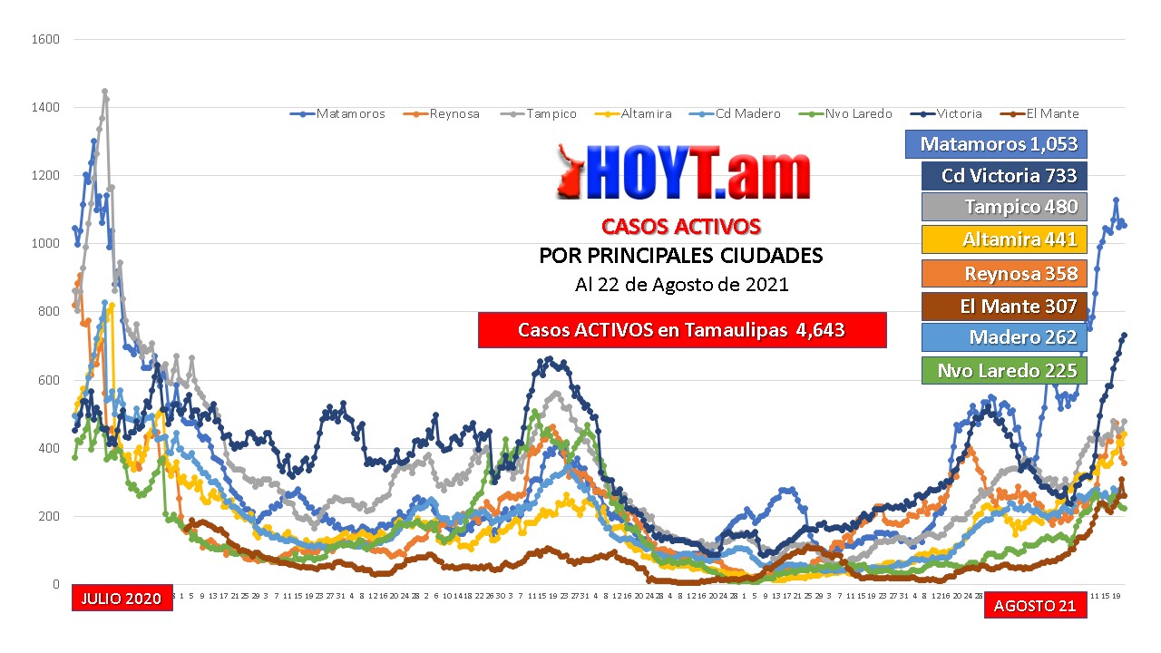 Durante la última semana, Tamaulipas ha mantenido la curva de casos activos por arriba de los 4 mil, impactando severamente a las principales ciudades, entre ellas Matamoros que tiene 1,053 personas actualmente padeciendo la enfermedad.