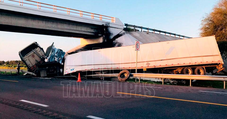 Ciudad Victoria, Tamaulipas. - Un trailero resultó gravemente herido después de estrellar de manera frontal su pesada unidad contra el muro de concreto de un puente vehicular en Ciudad Victoria.