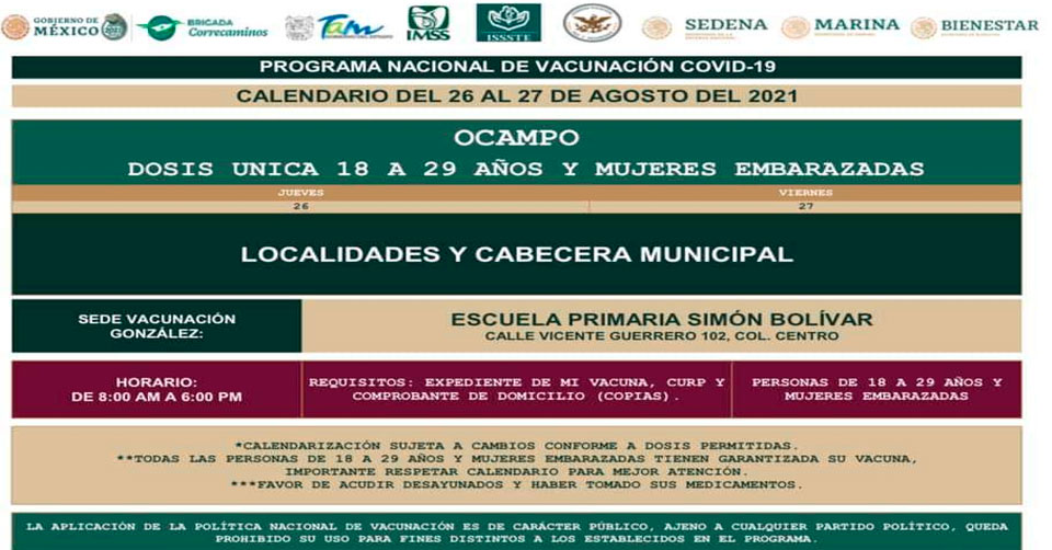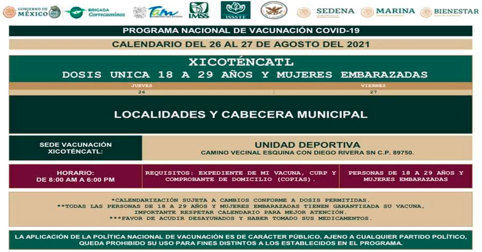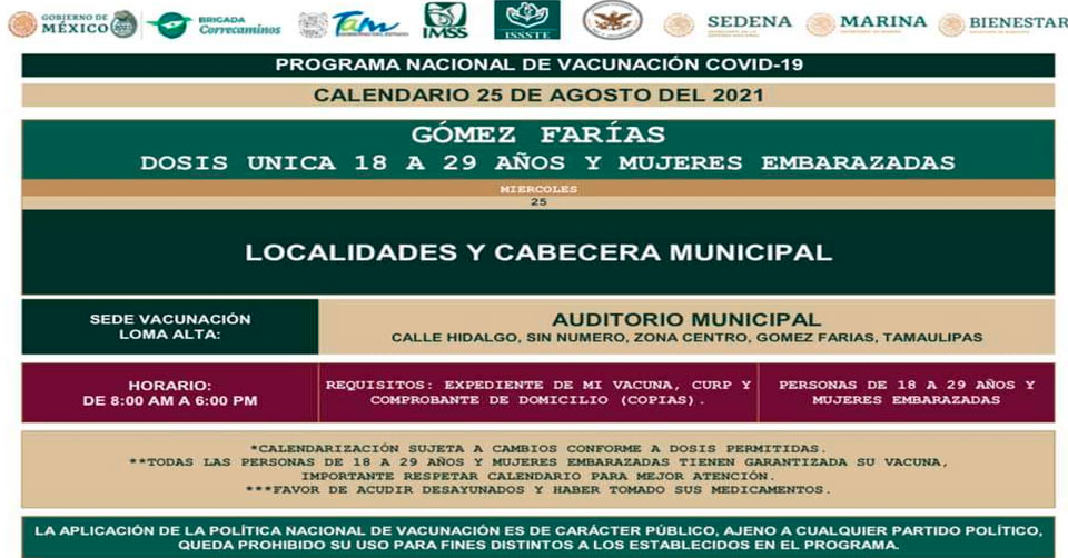 Ciudad Victoria, Tamaulipas. - La vacunación contra el Covid-19 para las personas de 18 a 39 años de edad y mujeres embarazadas iniciará el 25 de agosto en Gómez Farías, mientras que los días 26 y 27 en Xicoténcatl y Ocampo, respectivamente, informó el delegado de los Programas Federales en Tamaulipas, José Ramón Gómez Leal.