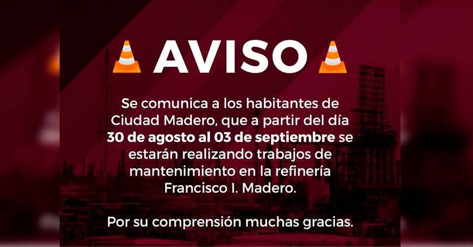 Ciudad Madero, Tamaulipas. - La empresa Petróleos Mexicanos (Pemex) informó a las autoridades de Madero sobre el mantenimiento y correcciones a sus instalaciones, lo que podría generar estruendos y ruidos extraños en la zona, por lo que se pide a la población no alarmarse, informó el director de Protección Civil (PC), Romel Martínez Flores.