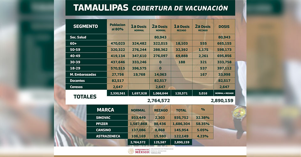Ciudad Victoria, Tamaulipas. - El delegado de Programas Federales para el Desarrollo en Tamaulipas, José Ramón Gómez Leal, informó que la población tamaulipeca ha recibido 2 millones 890 mil 159 dosis contra el virus SARS-CoV-2.