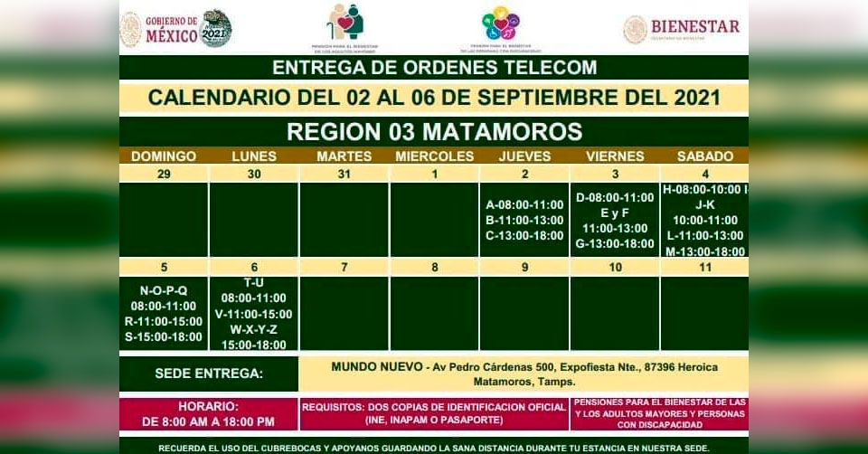 Matamoros, Tamaulipas. - La entrega de las órdenes de pago Telecom para los abuelitos de 65 y Más comenzará a partir del jueves 2 de septiembre en el Centro de Convenciones Mundo Nuevo.