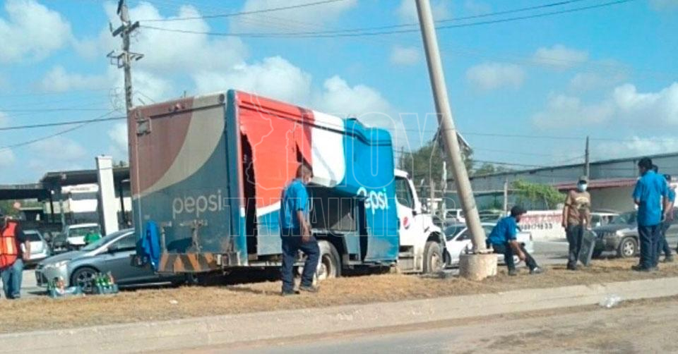 Matamoros, Tamaulipas. - Un camión repartidor de la empresa refresquera Pepsi se estrelló contra el poste de una lámpara en Matamoros y por el impacto los tripulantes resultaron lesionados.